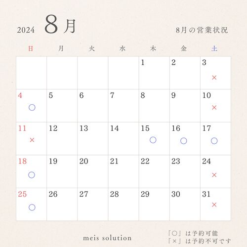 皆様こんにちは。meis solution イメージコンサルタントの藤澤です。 8月の営業日のお知らせです。 基本的に土・日に営業しております。 もちろん平日でもお問い合わせがあれば営業いたします。 どうぞお気軽にお問い合わせください。 当社では、受診者の方…