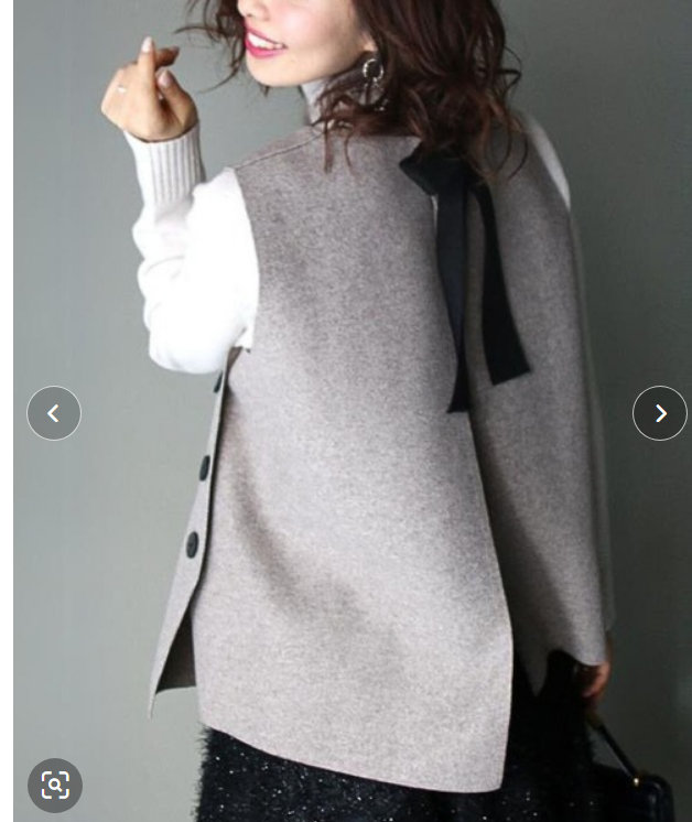ノースリーブで着てるのでもしかしたら夏物かもしれませんが、参考ということで許してください。アバンギャルドの方は、ファッショナブルタイプの小型版ともいえますので、直線ラインが得意です。ですから、このベスト(ベストってゆうてもーた)はすべて直線でてきていますので似合うのです。ポイントは、ボタンがちょっとずれた位置についていること、コンパクトなことです。ヘム(裾)も丁寧な仕事で綺麗にカットされているのもポイント高いです!