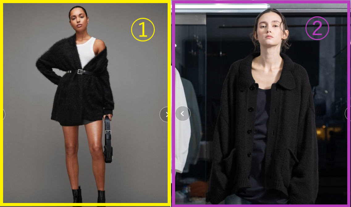 ちなみに、右②のカーディガンは、ナチュラルタイプの方が着るときはボタンを閉じても開けても似合うはずです。